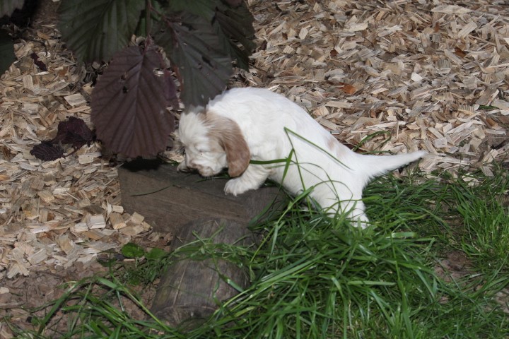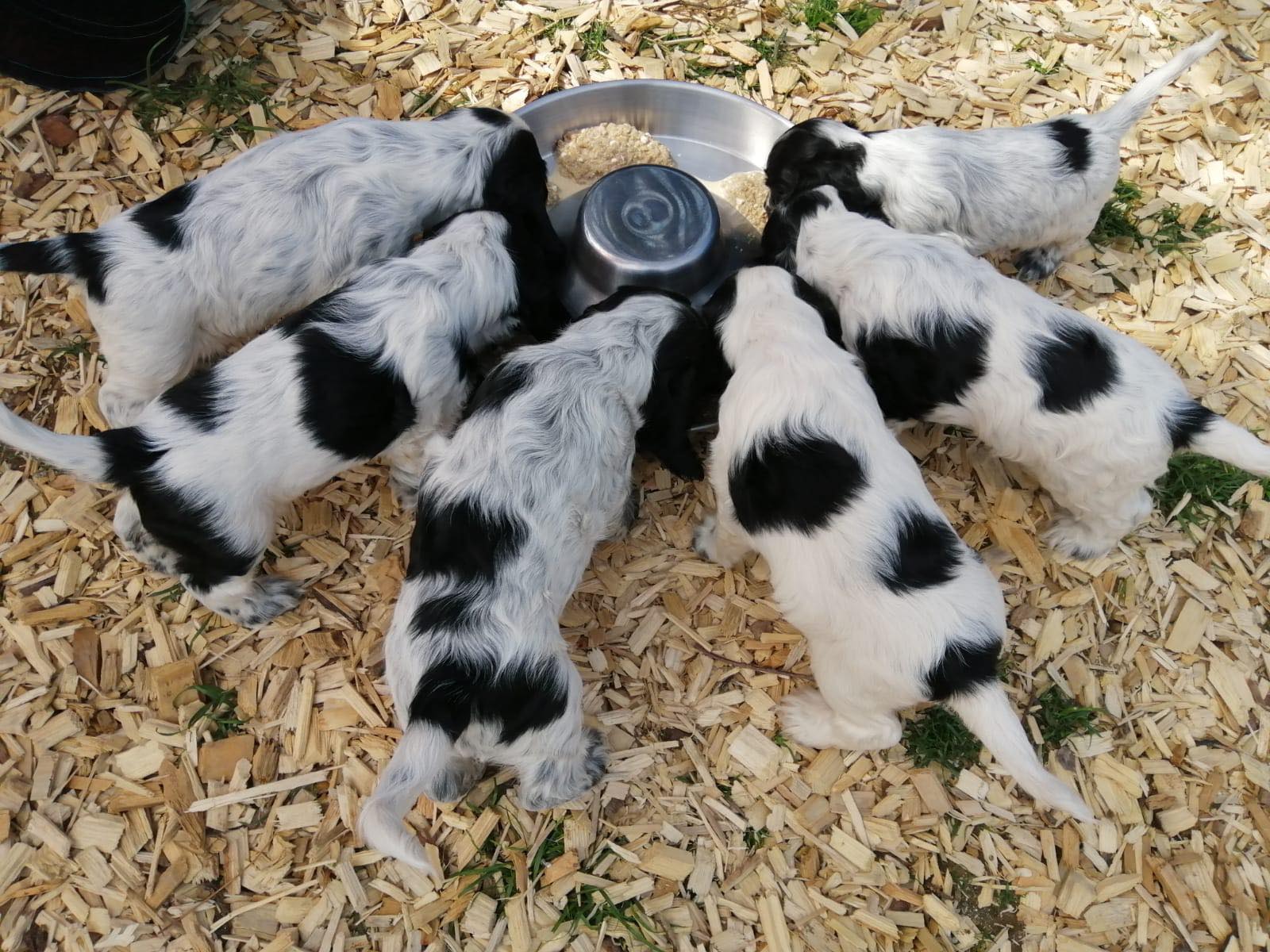 Die Welpen sind jetzt zu ersten Mal in den Außenauslauf gezogen und fressen schon sehr gut selbstständig. Alle entwickeln sich prima.